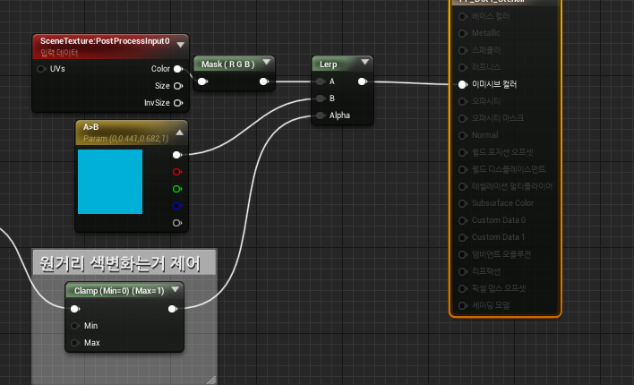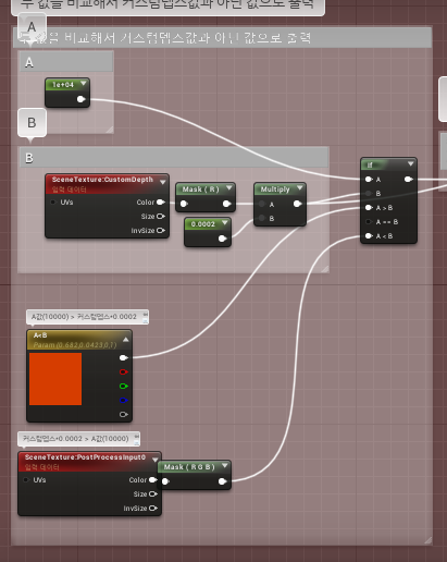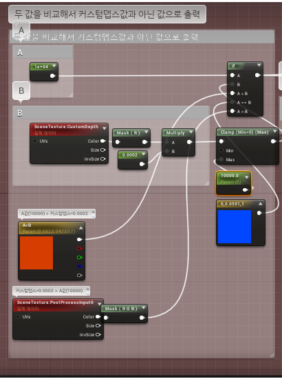 ![]() 테스트로 A값 10000과 Clamp를 건 CustomDepth*0.0002의 값을 비교하는데 Clamp의 Max값이 10000미만일떄는 주황, 같을때는 블루, 초과일떄는 SceneTexture임을 확인 |